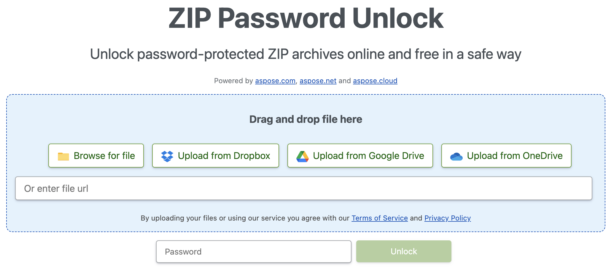Sie können die passwortgeschützten ZIP Dateien ganz einfach mit dem Free Online ZIP Unlocker Tool entsperren: