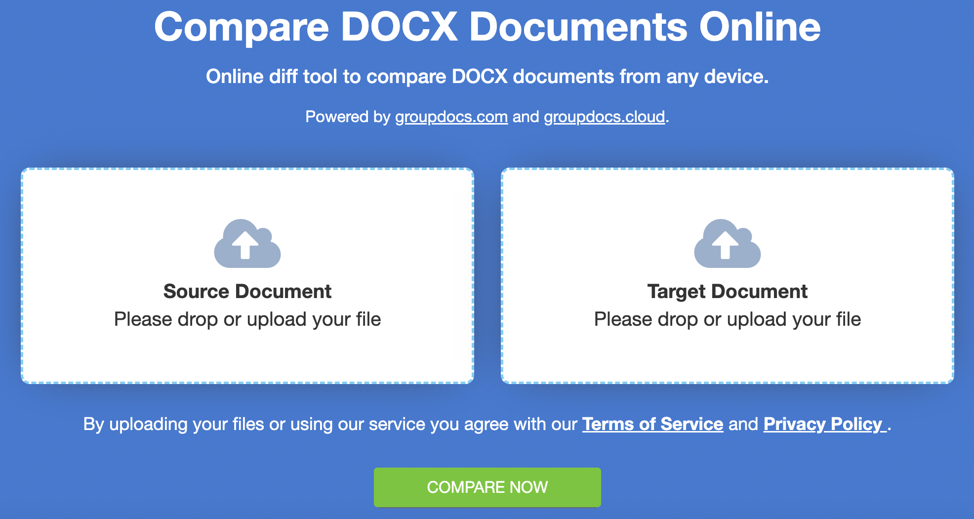 Prześlij swoje dokumenty: Prześlij źródłowe i docelowe dokumenty programu Word, które chcesz porównać. Możesz przeciągnąć i upuścić lub przeglądać pliki, aby je wybrać.