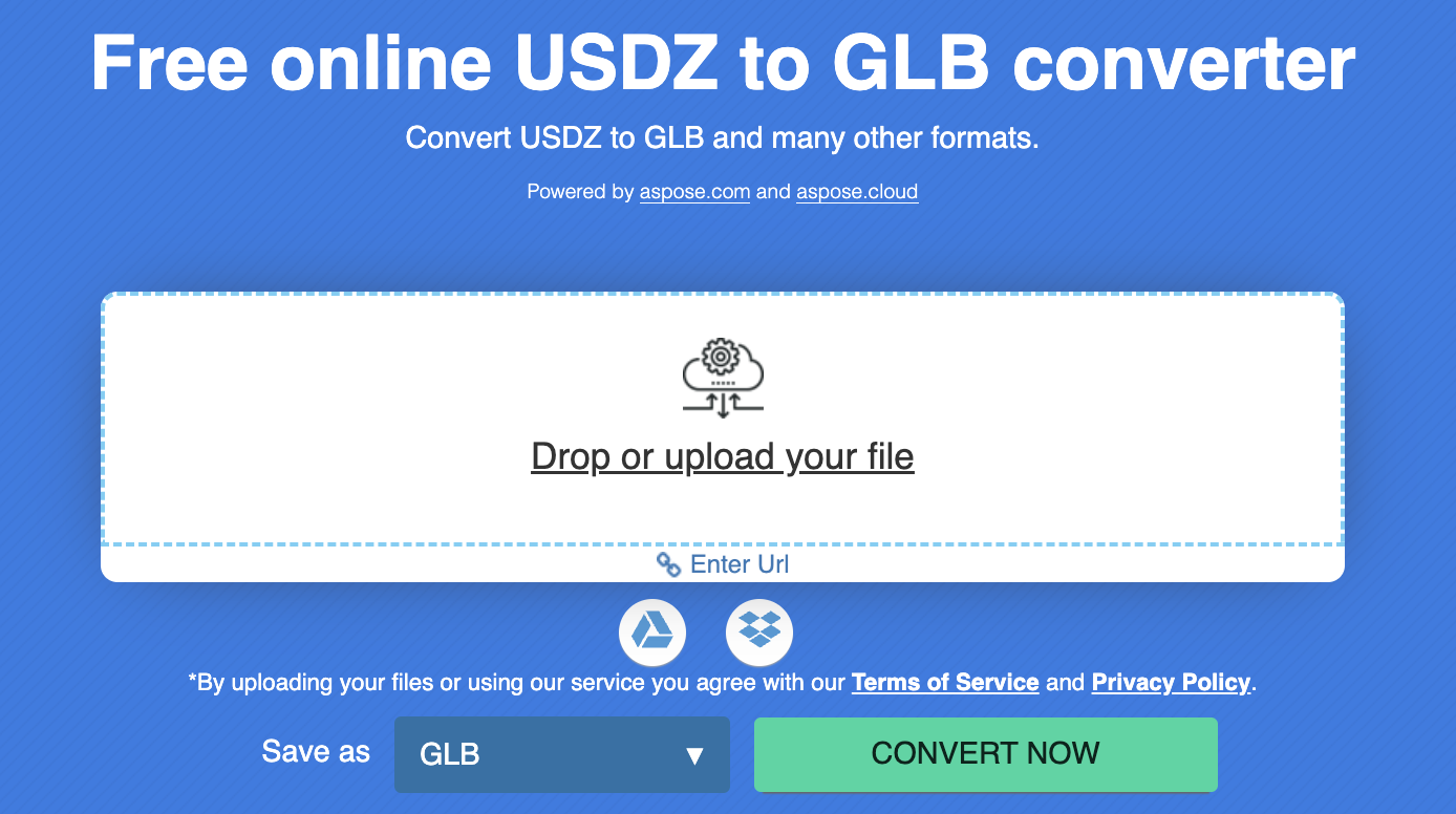 - Kliknij przycisk Konwertuj teraz, aby przekonwertować USDZ na GLB online.