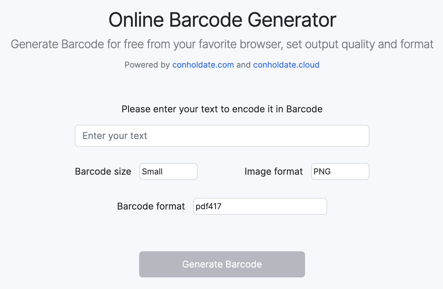 Bu Çevrimiçi barkod oluşturucu, sayılar veya metin gibi giriş verilerini bir barkod görüntüsüne dönüştürmek için algoritmalar kullanır. Kullanıcılar verilerini giriyor, bir barkod türü seçiyor, gerekirse ayarları kişiselleştiriyor ve oluşturucu, indirilebilen veya yazdırılabilen bir barkod görüntüsü üretiyor.